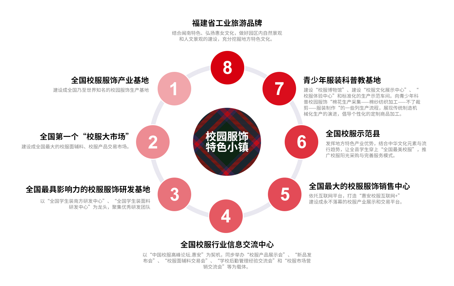 校服產(chǎn)業(yè)是惠安的傳統(tǒng)支柱產(chǎn)業(yè),也是伴隨著改革開發(fā)腳步發(fā)展起來的一個產(chǎn)業(yè)。特別是近年來,在中國教育裝備行業(yè)協(xié)會和上級黨委、政府的關(guān)心支持下,惠安的校服產(chǎn)業(yè)進(jìn)入了高速發(fā)展階段,目前擁有生產(chǎn)企業(yè)500余家、銷售隊伍上萬人,產(chǎn)銷量占據(jù)全國半壁江山?;莅部h委、縣政府高度校服產(chǎn)業(yè)的發(fā)展,研究制定更具針對性的幫扶政策,加大對校服企業(yè)生產(chǎn)性設(shè)備引進(jìn)、招投標(biāo)等方面的扶持力度,助力產(chǎn)業(yè)做大做強(qiáng),進(jìn)一步推動“工業(yè)設(shè)計”在惠安校服企業(yè)“落地生根”“生根發(fā)芽”“茁壯成長”;進(jìn)一步打響中國校園服飾產(chǎn)業(yè)基地品牌,推動中國校園服飾產(chǎn)業(yè)基地落地;進(jìn)一步完善校服產(chǎn)業(yè)鏈條,彌補(bǔ)企業(yè)研發(fā)短板,做大做強(qiáng)惠安校服產(chǎn)業(yè)。本概念規(guī)劃是為創(chuàng)建“中國校園服飾產(chǎn)業(yè)基地”而進(jìn)行的探討實(shí)踐。