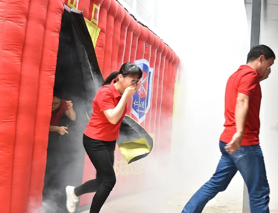 隨后,全體員工進(jìn)行了濃煙體驗應(yīng)急逃生和滅火的綜合演練。緊急逃生模擬封閉場館火災(zāi)情景,全體員工在密閉的環(huán)境下演練正確逃生方法。濃煙體驗小黑屋被遮得嚴(yán)嚴(yán)實(shí)實(shí),冒出陣陣濃煙,參與實(shí)訓(xùn)的員工在徐教官的指導(dǎo)下,捂住口鼻,俯著身,沿著墻面,一一體驗了一把火場逃生的真實(shí)場景。