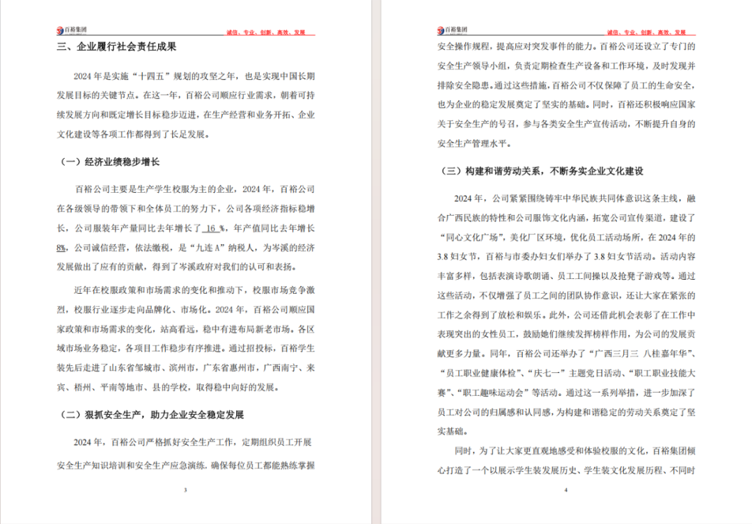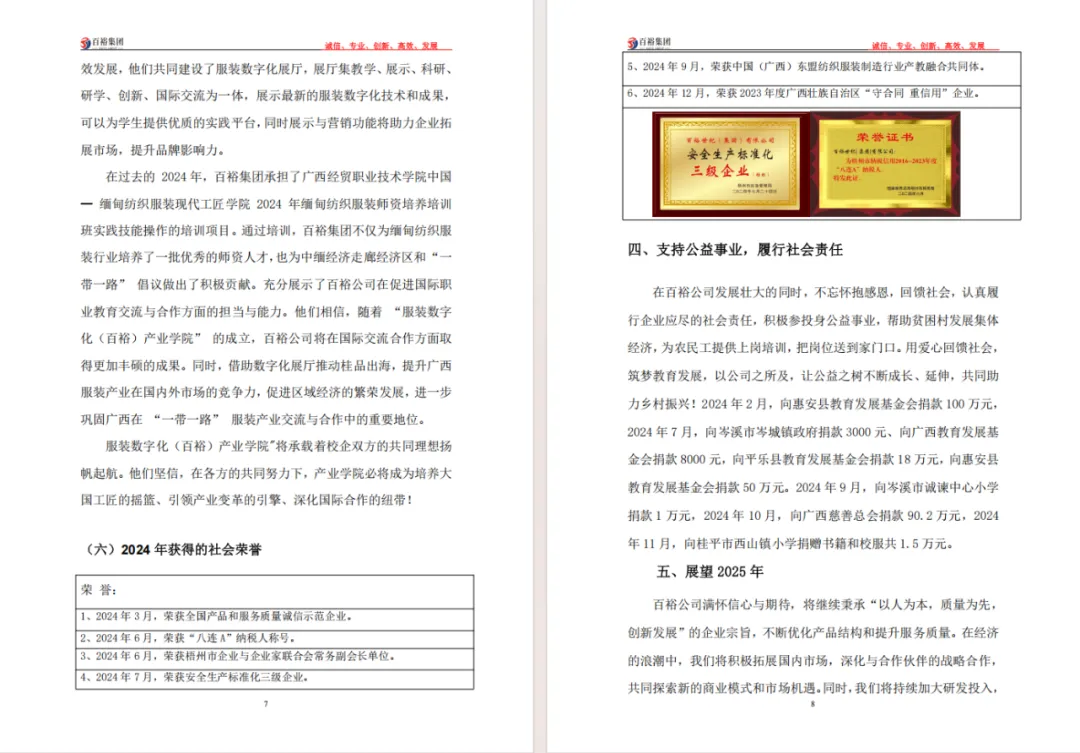 百裕集團2024年度社會責(zé)任報告的發(fā)布,不僅是企業(yè)對社會各界的責(zé)任承諾,更是對自身可持續(xù)發(fā)展的戰(zhàn)略規(guī)劃。未來,百裕集團將繼續(xù)秉承"時尚傳承,責(zé)任同行"的理念,以責(zé)任鑄就品牌,以行動回饋社會,持續(xù)書寫企業(yè)與社會共同發(fā)展的新篇章,為行業(yè)可持續(xù)發(fā)展和社會和諧進步貢獻更多力量。