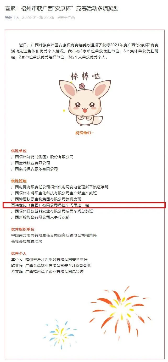 1月06日,廣西壯族自治區(qū)安康杯競賽組委辦通報了獲得2021年度廣西“安康杯”競賽活動先進(jìn)集體和優(yōu)秀個人情況。百裕世紀(jì)(集團(tuán))有限公司吊掛車間吊掛一組榮獲“優(yōu)勝班組”稱號。