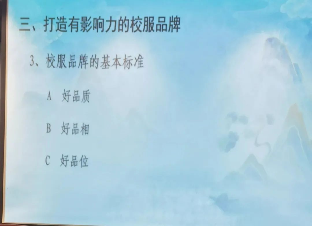 跟大家分享構(gòu)建校服品牌高質(zhì)量發(fā)展的一些感悟:堅(jiān)持、堅(jiān)守、堅(jiān)信、制造、創(chuàng)造、智造。