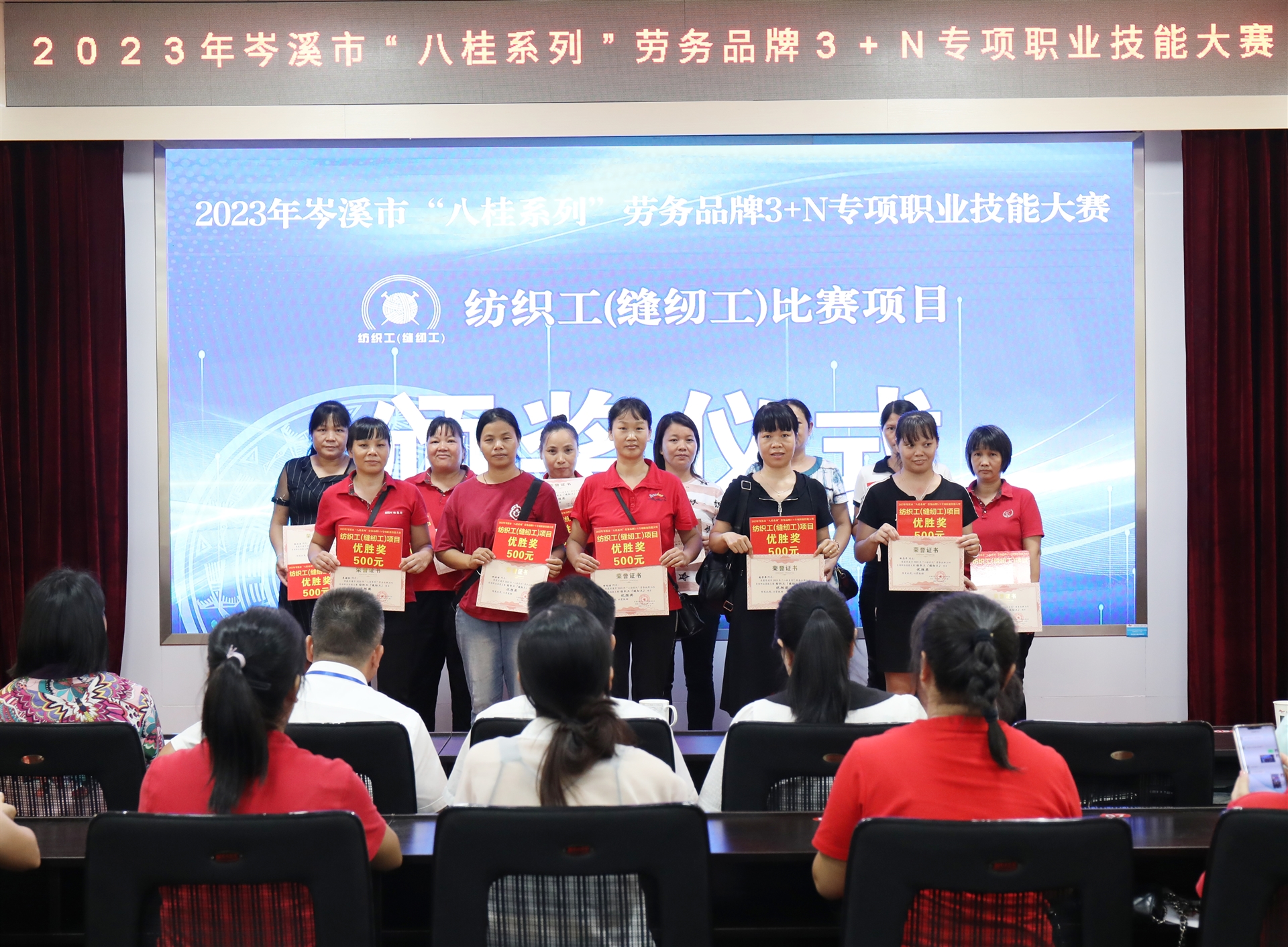 百裕世紀(jì) (集團)有限公司線下車間職工超麗榮獲紡織工 (縫工)比賽項目的一等獎;羅婷婷、陳杏娟2位職工榮獲二等獎;梁鳳、羅獻(xiàn)鳳、覃廣英、莫清云、廖芬藝5位職工榮獲三等獎;陳海蘭、陳志平、張紅潔等12名職工榮獲優(yōu)勝獎。