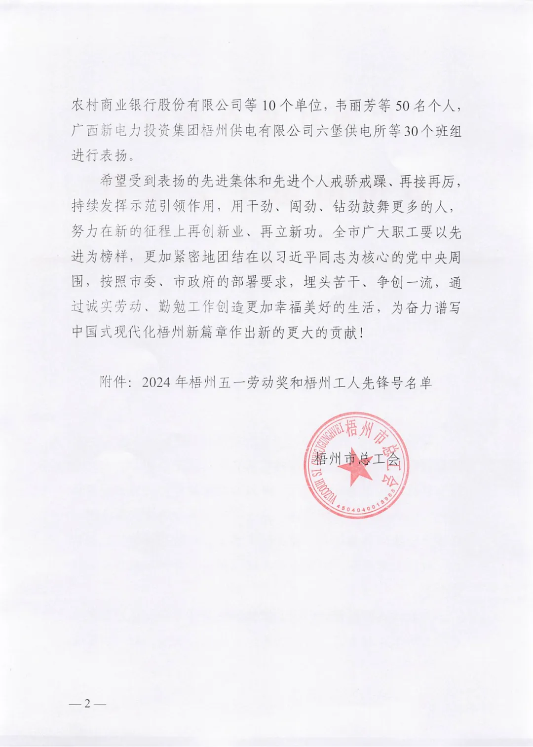 4月26日,梧州市總工會印發(fā)《梧州市總工會關(guān)于表揚2024年梧州五一勞動獎和梧州工人先鋒號的通報》,百裕世紀(集團)有限公司羅獻鳳同志榮獲2024年“梧州五一勞動獎?wù)隆薄?/span>