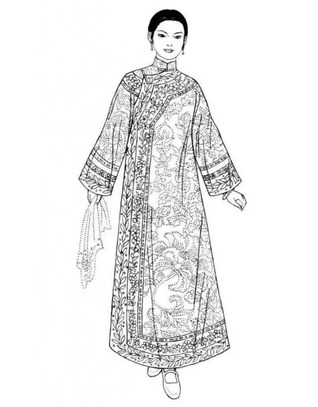 清朝后期,旗女(滿(mǎn)洲女子)所穿的長(zhǎng)袍,衣身較為寬博,造型線(xiàn)條平直硬朗,衣長(zhǎng)至腳踝。“元寶領(lǐng)”用得十分普遍,領(lǐng)高蓋住腮碰到耳,袍身上多繡以各色花紋,領(lǐng)、袖、襟、裾都有多重寬闊的滾邊。同治年間,鑲、滾技藝達(dá)到高峰時(shí)期,有的甚至整件袍服全用刺繡、花邊鑲滾,幾乎難以辨認(rèn)原本的衣料。旗女袍服的裝飾繁瑣至登峰造極的程度,從另一個(gè)方面也凸顯了強(qiáng)權(quán)霸主的欲望。