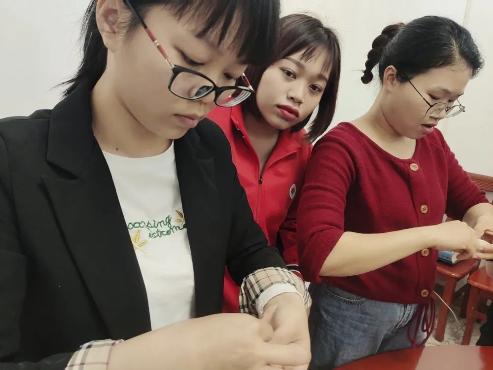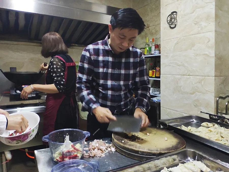 大家齊聚一堂相互交流經(jīng)驗學(xué)習(xí),和面、搟皮、拌餡.....分工明細(xì),不一會兒,一盤盤整齊飽滿的餃子就出來了。