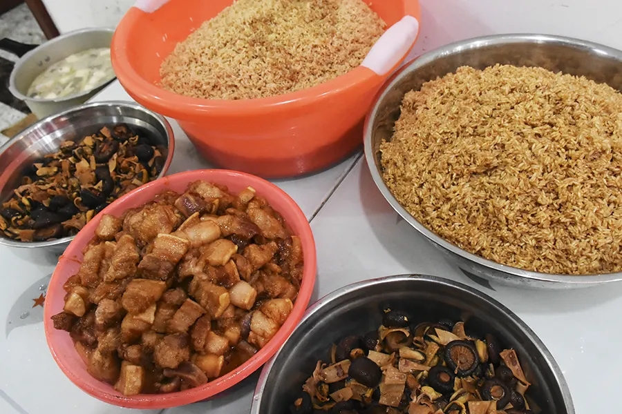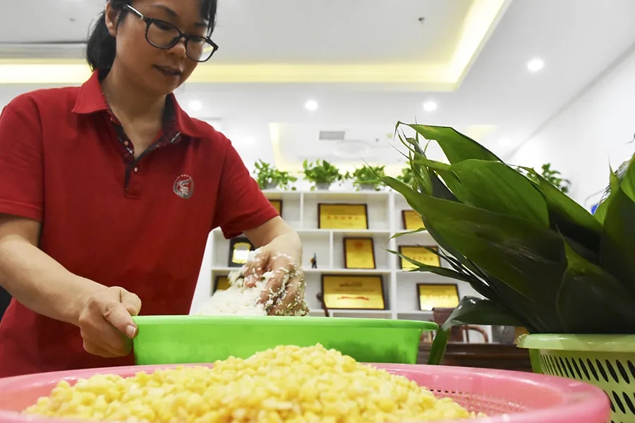 后勤部精心為大家準備了豐富的食材五花肉、雞蛋、香菇、魷魚、海蠣、綠豆,并根據(jù)員工喜好調配好兩種不同口味餡料。